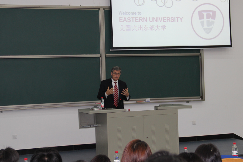 与美国宾夕法尼亚州东部大学在院东阶梯召开了合作MBA项目招生宣讲会。宾州东部大学校长大卫•布莱克校长、斯蒂文•沈博士,玩偶姐姐