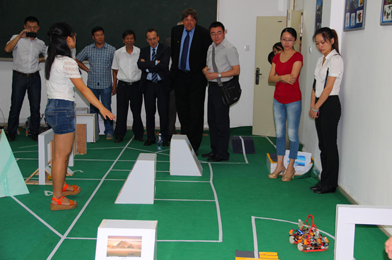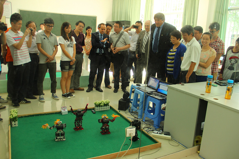 代表团一行首先在电气工程系会议室进行座谈。座谈会上,电气工程系主任郑崇苏副教授、机械工程系主任范扬波副教授分别介绍了所在系的专业、学生数、培养计划、师资力量等基本情况。双方就专业建设、人才培养等进行了简单交流。座谈会后,代表团一行还参观了电气工程系机器人创新实践室,观摩了即将赴安徽参加中国机器人大赛暨RoboCup机器人公开赛的机器人作品演示。代表团高度赞扬了学生创新作品,并对学院办学成果给予了充分肯定。