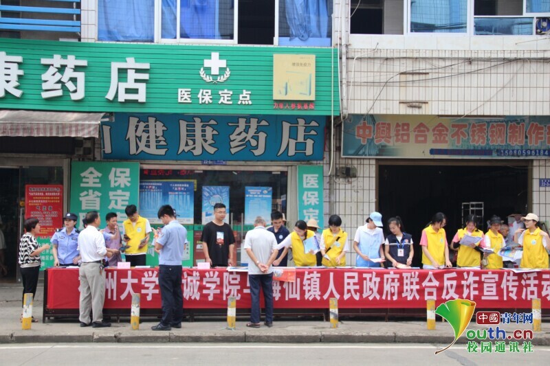 图为实践队队员和梅仙镇政府工作人员联合进行反诈宣传活动