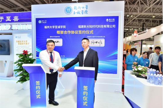 与福建网龙计算机网络信息技术有限公司在活动现场签订校企合作框架协议,双方共建元宇宙数字产业学院。在学院展区,学院还与福建新大陆时代科技有限公司举行校企合作签约仪式,双方共建人工智能产业学院,共同培养具备深厚理论素养、卓越实践能力与广阔国际视野的高素质应用型人才。