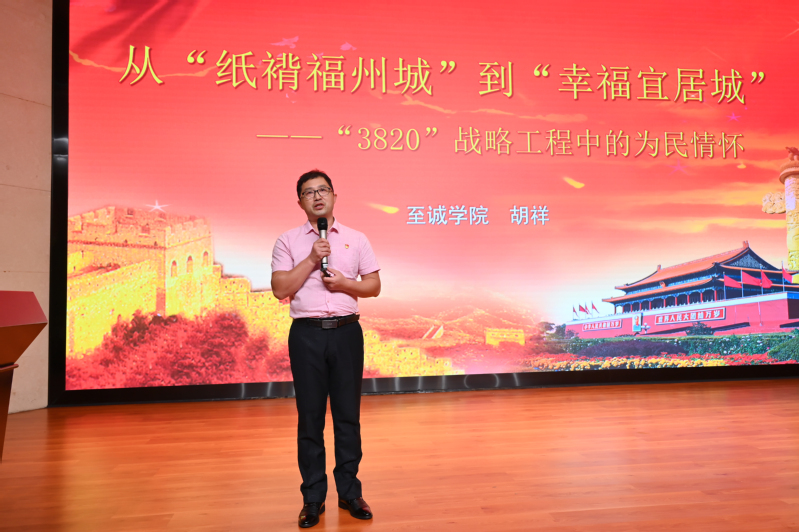 胡祥同志以《从“纸褙福州城”到“幸福宜居城”——“3820”战略工程中的为民情怀》为题,通过“纸褙福州城”和“幸福宜居城”的强烈对比,讲述福州市广大党员干部坚持以人民为中心的发展思想,根据“3820”战略工程构想和《福州市城市总体规划(1995-2010)》,坚持老城提升与新区拓展并举,城市建设有序展开,布局进一步优化,城市发展的个性特色得到彰显。尤其在旧屋区改造方面,实施了“安居工程”“广厦工程”“造福工程”等,极大改善了群众的住房条件的动人故事。展现了三十年来,福州牢记嘱托、勇毅前行,坚持人民至上的价值追求,经过一次次的更新改造,昔日“纸褙福州城”已然成为繁华似锦的新闽都的伟大成就。