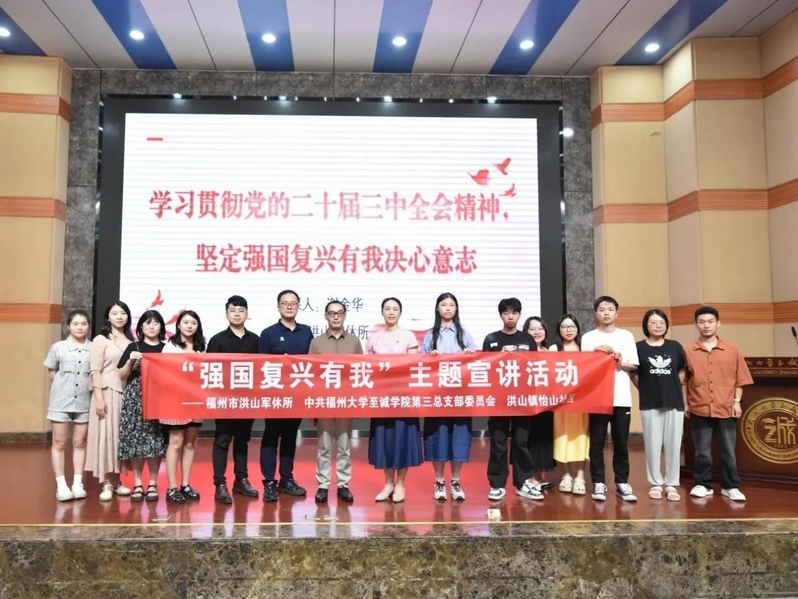 谢金华以“学习贯彻党的二十届三中全会精神,坚定强国复兴有我决心意志”为题,围绕“党的二十届三中全会《决定》简况”“唯有众志成城方能强国复兴”“肩负起强国复兴有我的青年担当”三个章节,以主旋律电影《觉醒年代》《长津湖》《红海行动》为切入点,结合自身军旅经历,解读党的二十届三中全会精神,讲述红色历史。
