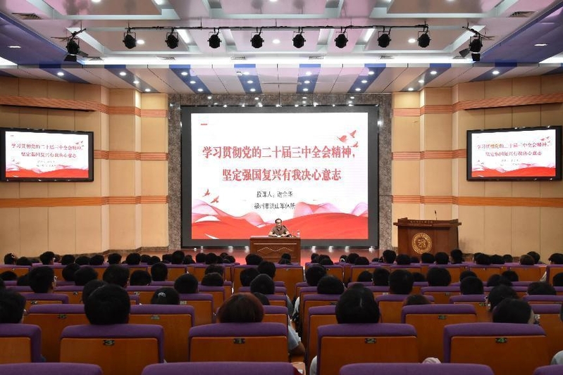 谢金华以“学习贯彻党的二十届三中全会精神,坚定强国复兴有我决心意志”为题,围绕“党的二十届三中全会《决定》简况”“唯有众志成城方能强国复兴”“肩负起强国复兴有我的青年担当”三个章节,以主旋律电影《觉醒年代》《长津湖》《红海行动》为切入点,结合自身军旅经历,解读党的二十届三中全会精神,讲述红色历史。
