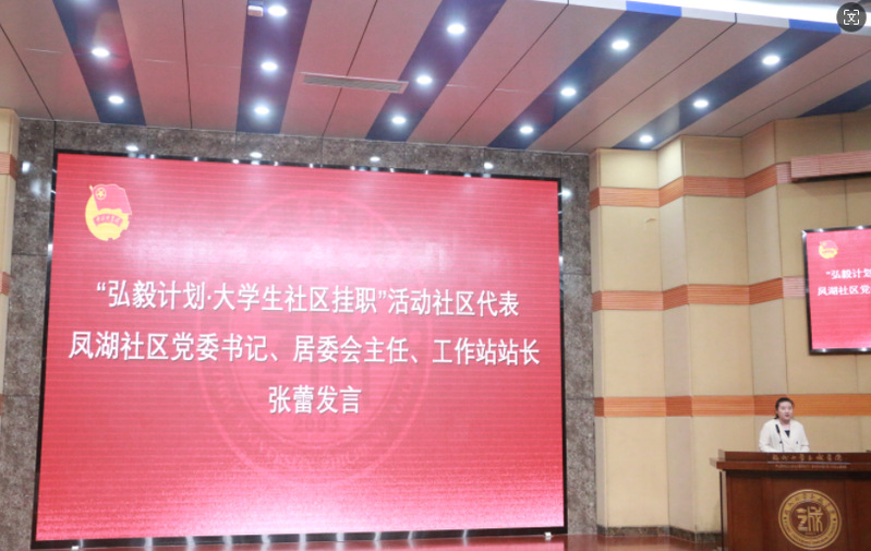 凤湖社区党委书记、居委会主任、工作站站长张蕾发言,她充分肯定了“弘毅计划·大学生社区挂职”活动所取得的成效,对挂职同学为社区工作做出的贡献表达了感谢,希望他们以此为起点,在未来的学习生活中能够学以致用,实现能力提升和个人成长。