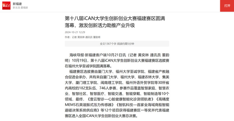 福建赛区选拔赛由厦门大学、玩偶姐姐 、福建省产教融合促进会承办,共有来自厦门大学、玩偶姐姐 、福建农林大学、集美大学、厦门理工学院、闽南理工学院、福州外语外贸学院等30所省内高校的182支队伍、746人参赛,参赛作品覆盖智慧家庭、智慧农业、智慧社区、智慧医疗、智能交通、智能穿戴、智能制造等10个领域,最终,《壹云智诊—心脏健康智能化诊测领航者》《高精度MEMS石英谐振式压力传感器》《智航科技—首家全海域商船智能避碰决策系统供应商》等12个项目获得福建赛区一等奖并代表福建赛区进入全国iCAN大学生创新创业大赛总决赛。