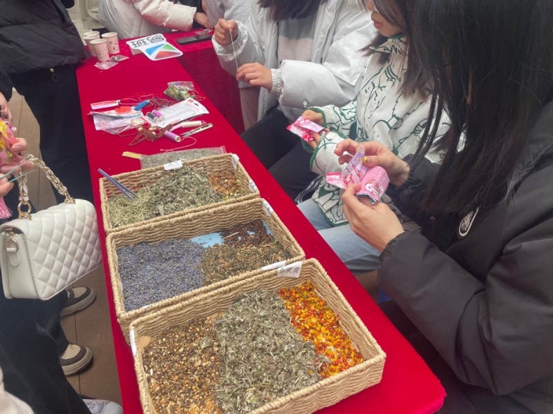 讲座结束后,至臻园内设置了多个互动体验区。在“养生香囊制作区”,薰衣草、艾叶等药材的清香弥漫,参与者在志愿者指导下穿针引线,将传统驱邪避瘟的智慧缝制成精致香囊;而“养生茶饮体验区”则提供薄荷、金银花、陈皮等草本原料,师生们根据体质调配专属茶饮,在氤氲茶香中探讨养生心得。此外,“本草艺术工坊”别具匠心,干花、干叶化身创作素材,在艺术创作中感受中医药材的自然之美。