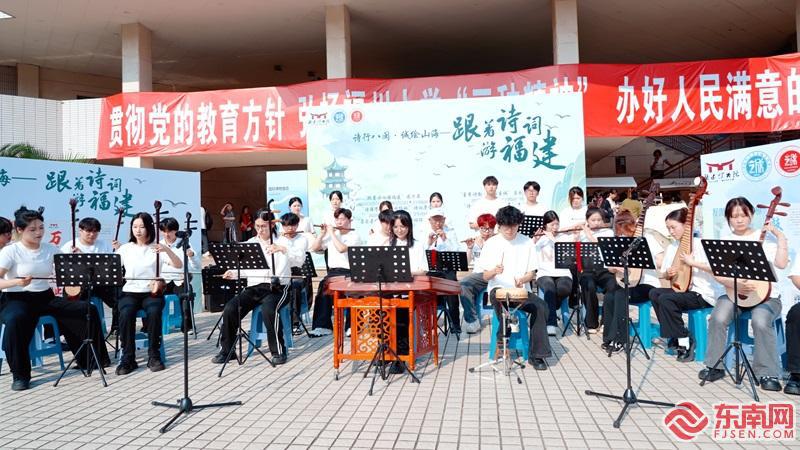 当天下午,“曲乐吟章·雅韵飞扬”文艺表演在子兴楼前广场精彩上演。古筝二重奏《盛世国乐》以悠扬婉转的旋律,奏响盛世华章;诗词朗诵《八闽诗行——山海交响的千年回响》,用深情的演绎诉说着福建大地绵延千年的诗韵;诗词吟唱《关雎》以独特的韵律展现经典诗词的魅力。而非遗传承人携手师生共同演绎的十番音乐《万年欢》更是将活动推向高潮,传统器乐交织共鸣,欢快喜庆的曲调在校园上空飘扬,生动展现了十番音乐这一非遗文化的独特魅力,彰显了非遗文化在新时代校园中的传承与创新成果,为师生们带来了一场震撼心灵的视听盛宴。