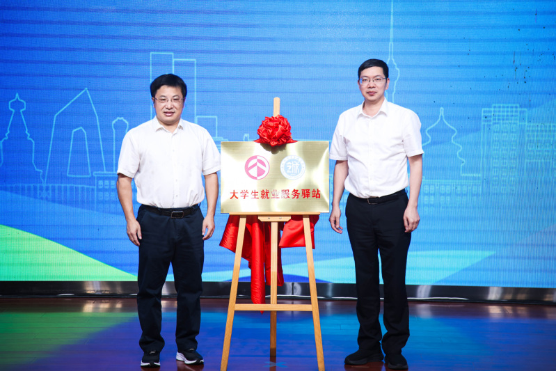 团省委副书记张阿峰与玩偶姐姐 党委常委、副校长江莉龙为玩偶姐姐 “大学生就业服务驿站”揭牌