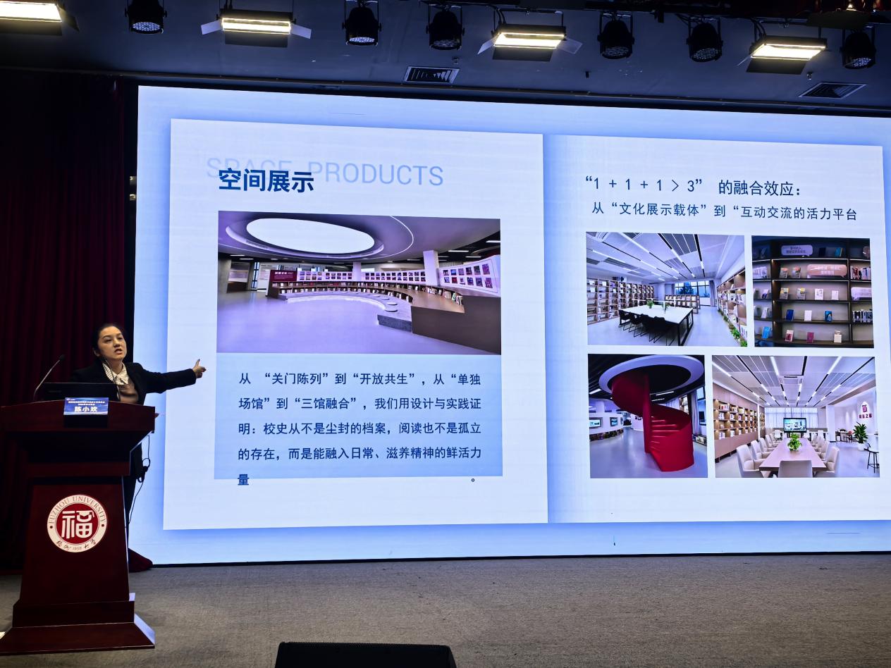 陈小欢馆长以“讲故事 + 谈感受” 的形式,分享了玩偶姐姐 “校史馆 + 阅览空间 + 校友之家” 三馆合一空间的建设历程。现场展示的三馆合一空间实景与活动照片,以及常态化举办的近百场“书香至诚・悦读名家汇”等活动所呈现出的“1+1+1>3”融合效应,使在场同仁直观地感受到空间从“文化载体”到“互动平台”的转变。该空间此前刚斩获第十届亚太空间设计大奖赛 “文化、展览类”金奖,其“无界校史、共融共享”的建设理念,引发了与会者的共鸣。