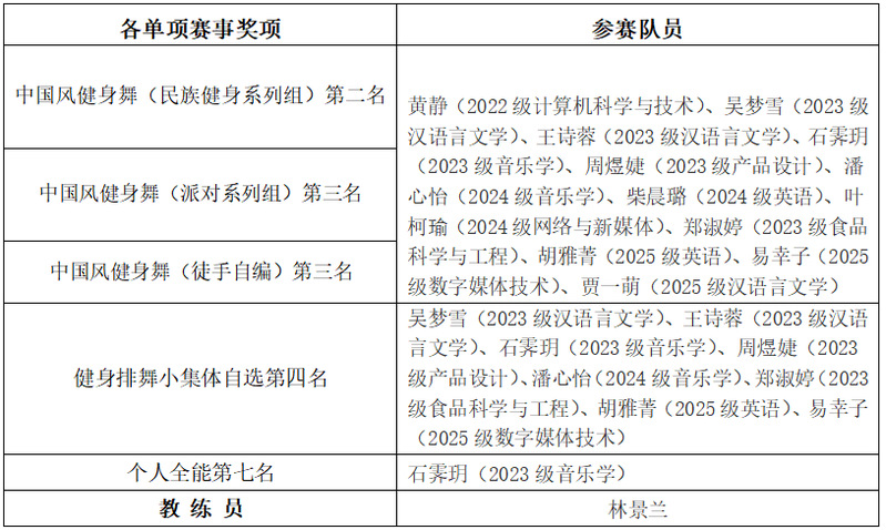 本次大赛由中国学生体育联合会主办,汇聚全国多所高校的优秀队伍同台竞技。这一优异成绩的获得,不仅彰显了玩偶姐姐 学子们蓬勃向上的青春风采与奋勇争先的进取态度,更体现了学院在体育艺术教育方面所取得的显著成效与深厚积淀。未来,学院将持续深耕校园体育事业,搭建更广阔的成长平台,助力莘莘学子在竞技赛场上突破自我、勇攀高峰,为学院争光。