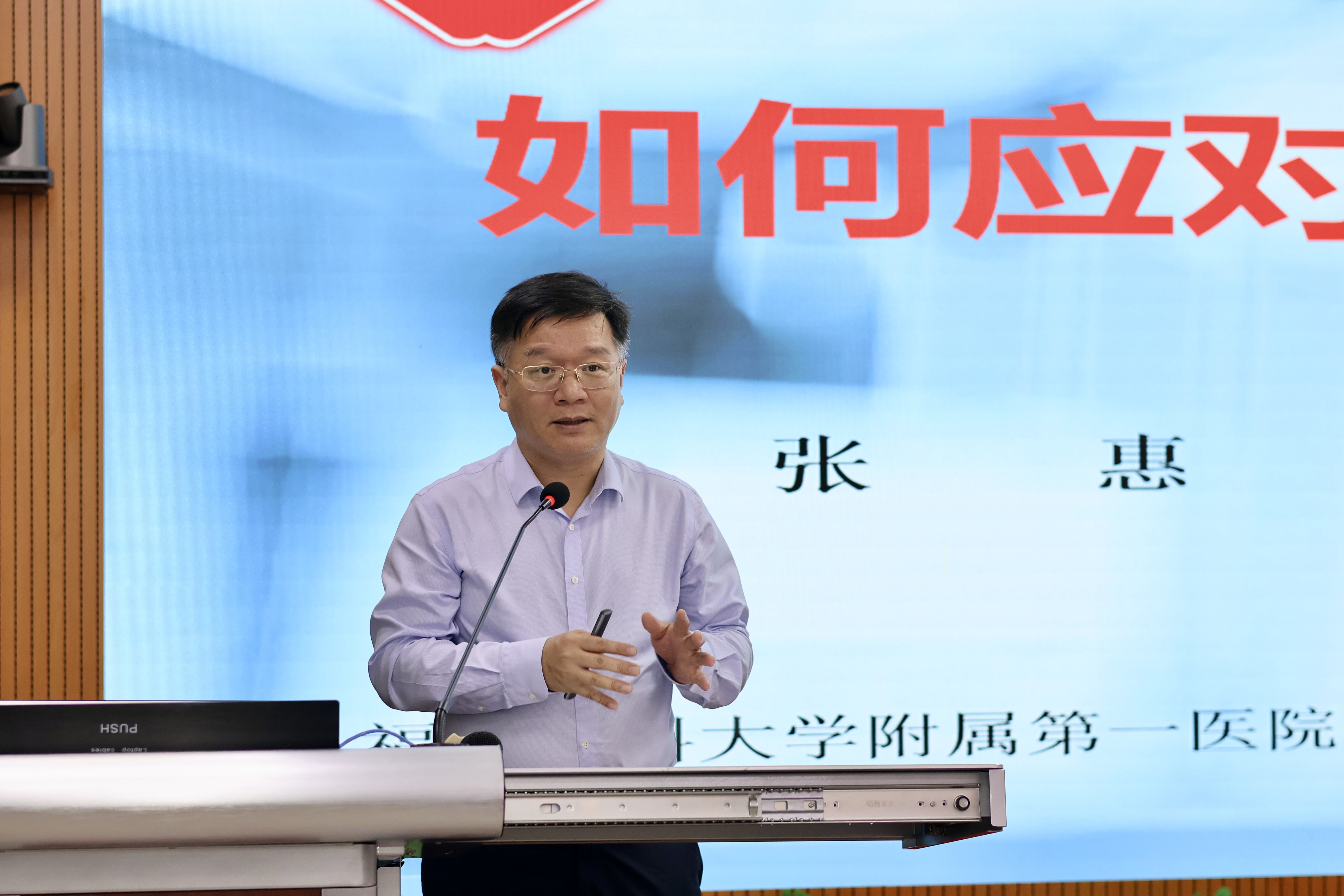 甲状腺乳腺外科行政副主任、副主任医师张惠灏从甲状腺结节的基本概念与发病现状出发,详细介绍了甲状腺结节的成因、症状识别、检测方式以及治疗方式等,并在饮食等方面给予预防指导。张惠灏医师以通俗易懂的语言加深了老师们对甲状腺疾病的了解,大大缓解了大家对于甲状腺疾病的恐惧与焦虑情绪。