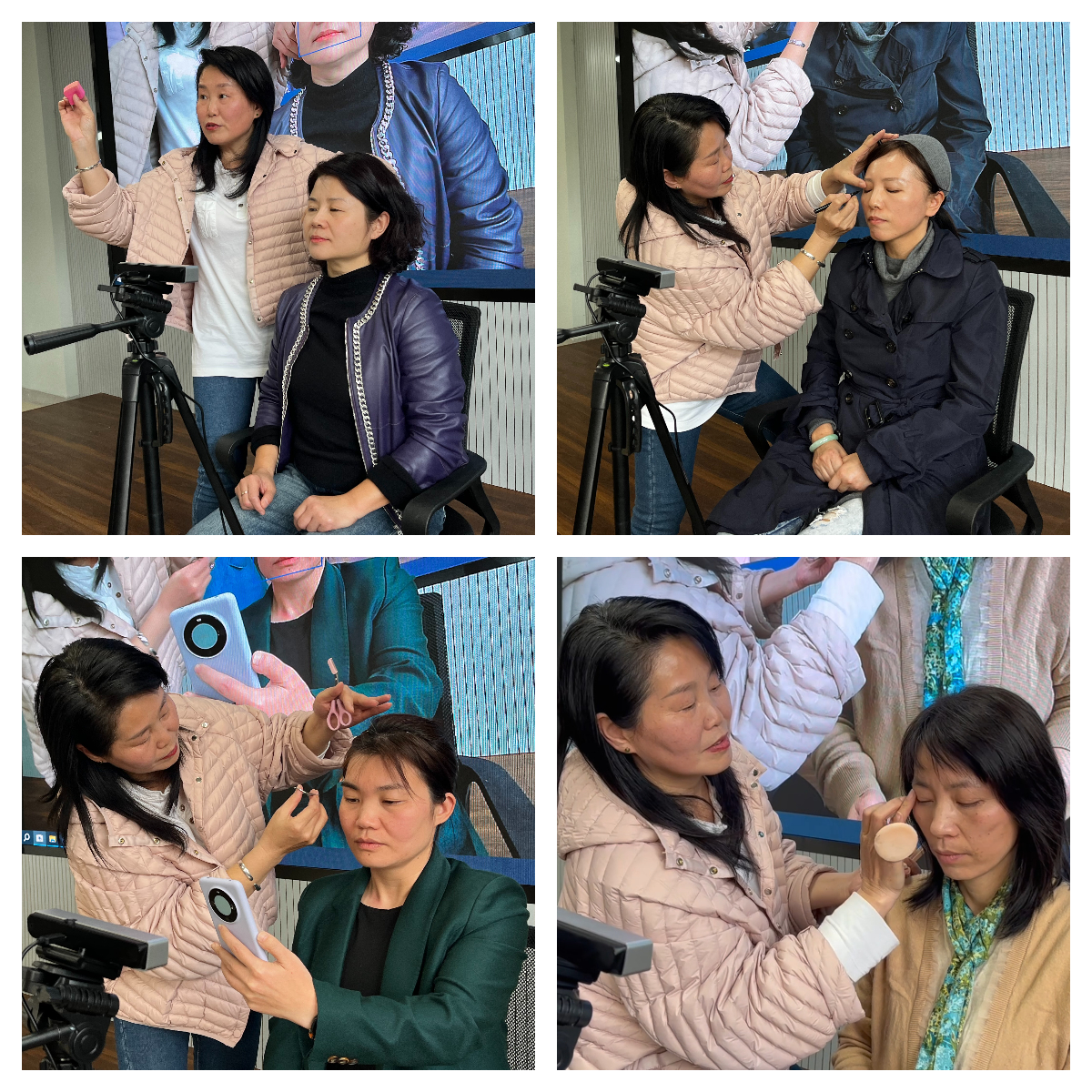 互动环节中,教师们争相将自己在化妆方面遇到的困惑一一抛出,提出“眼袋/黑眼圈遮瑕”“野生眉过密调整”“倦容肌焕亮”等问题,陈老师细致解答,分享了“通过冷暖调遮瑕膏叠加、在视觉上实现去眼袋”“依据鼻翼到外眼角延长线定眉长”“从眉峰处下笔而非从眉头画至眉尾,避免眉头紧锁”等实用妙招,现场掌声、欢笑声交织成片,气氛热烈。女教职工们不仅学到实用的化妆技能,在相互交流中还收获了满满自信,激起对美好生活的追求和热爱。