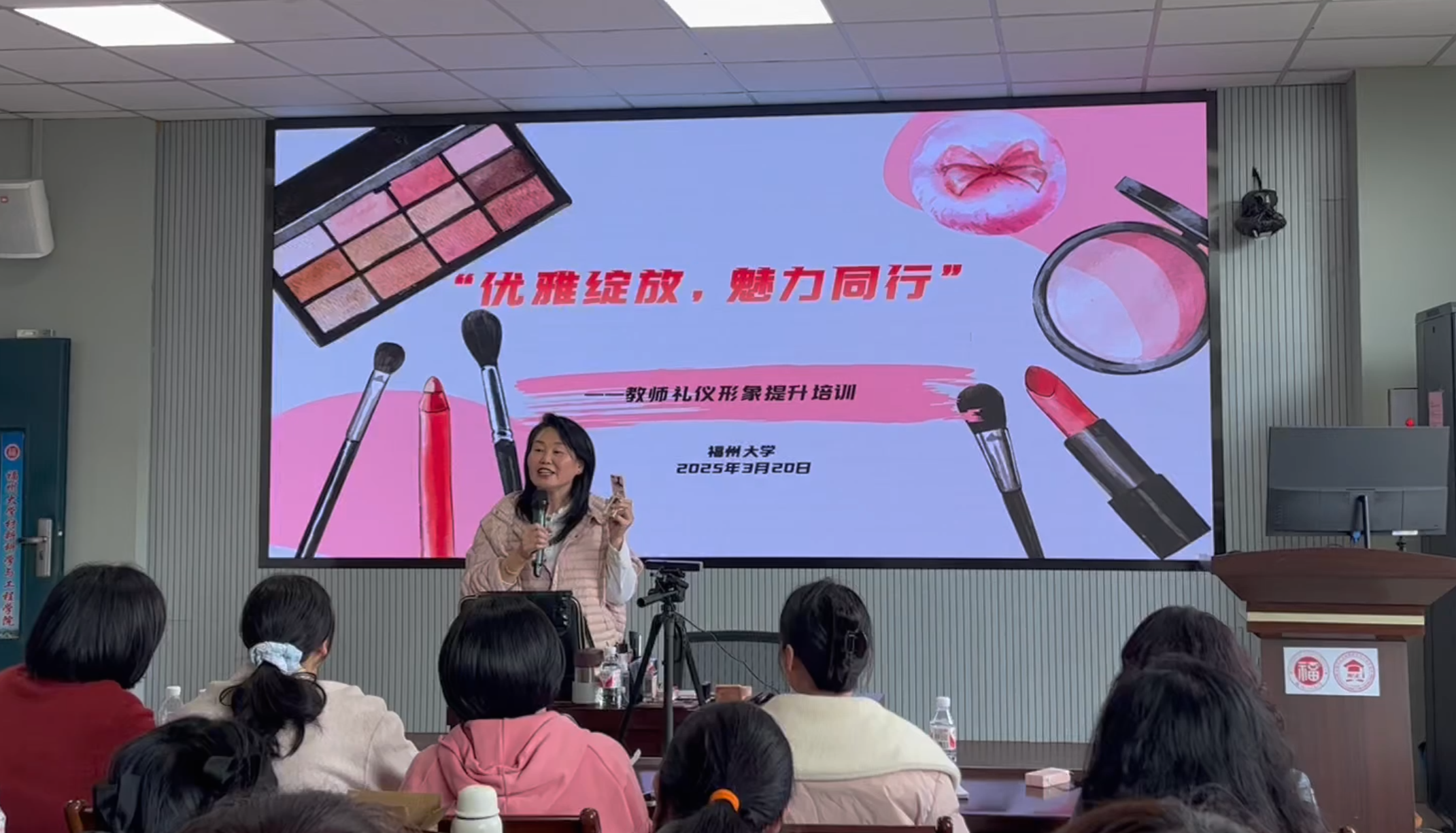 桃李春风暖,巾帼绽芳华。为献礼“三八”国际妇女节,提升教师的礼仪形象与气质,增强教师的职业认同感与归属感, 3月20日下午,化学学院、材料科学与工程学院、生物科学与工程学院、土木工程学院和马克思主义学院,五院共建联合举办“优雅绽放,魅力同行”教师礼仪形象提升培训。此次活动以妆造赋能、礼仪润心为纽带,为五院教师搭建起一场美学与职业素养的双向成长盛宴。