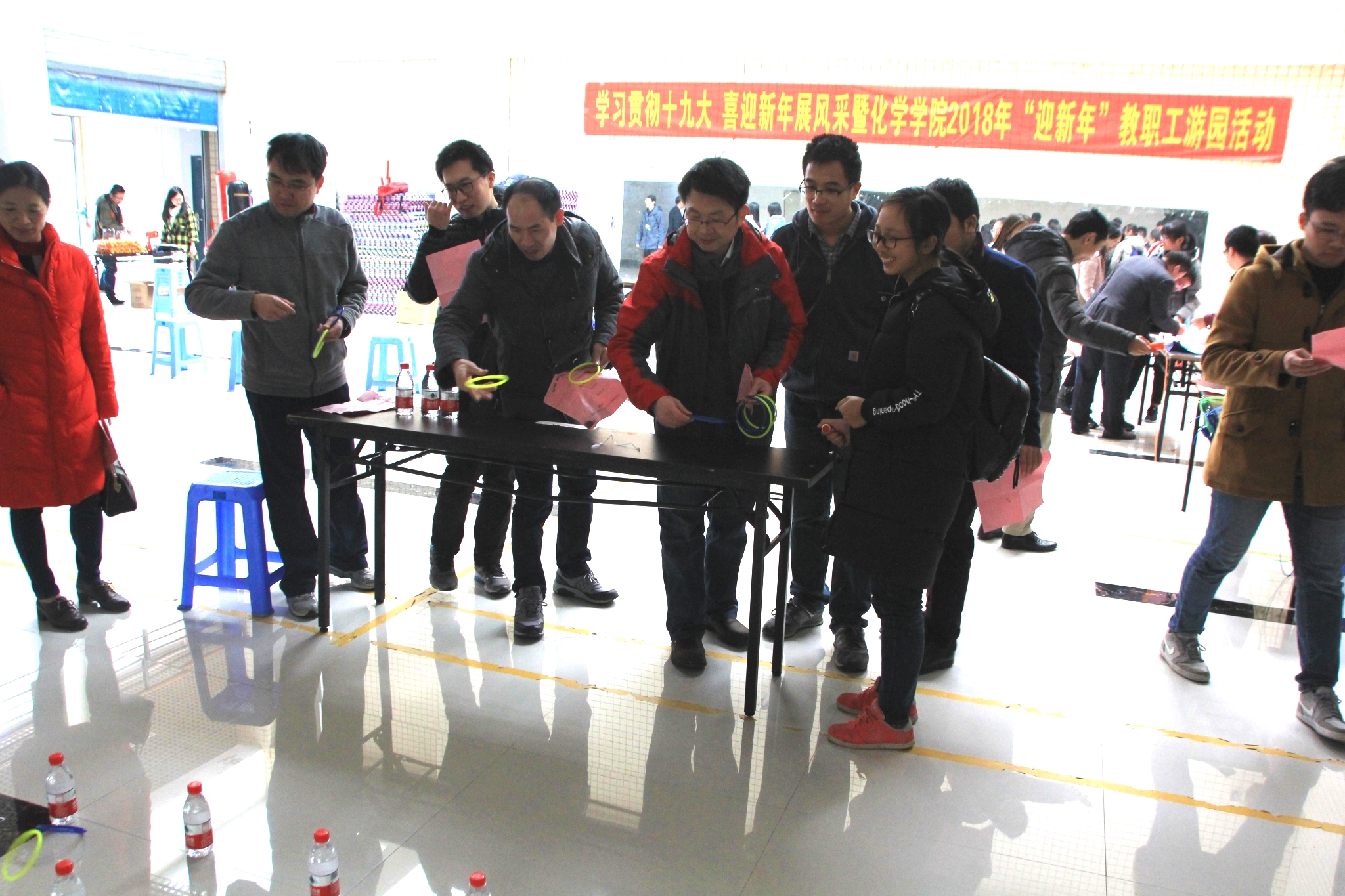 为丰富全院教职工文化生活,倡导“每天健身一小时,健康生活一辈子”理念,推进我院“健康幸福工程”的深入开展,增强教职工的身体素质和凝聚力,更好的推动化学一流学科的发展,2018年1月9日,我院在嘉锡楼一楼大厅举办了“学习贯彻十九大 喜迎新年展风采”教职工游园会。院党委石炳文书记、王心晨院长、院党委刘旺副书记、黄剑东副院长、袁耀锋副院长、唐点平副院长、院工会陈珠灵主席等党政工领导与全院教职工一起参加了此次活动。