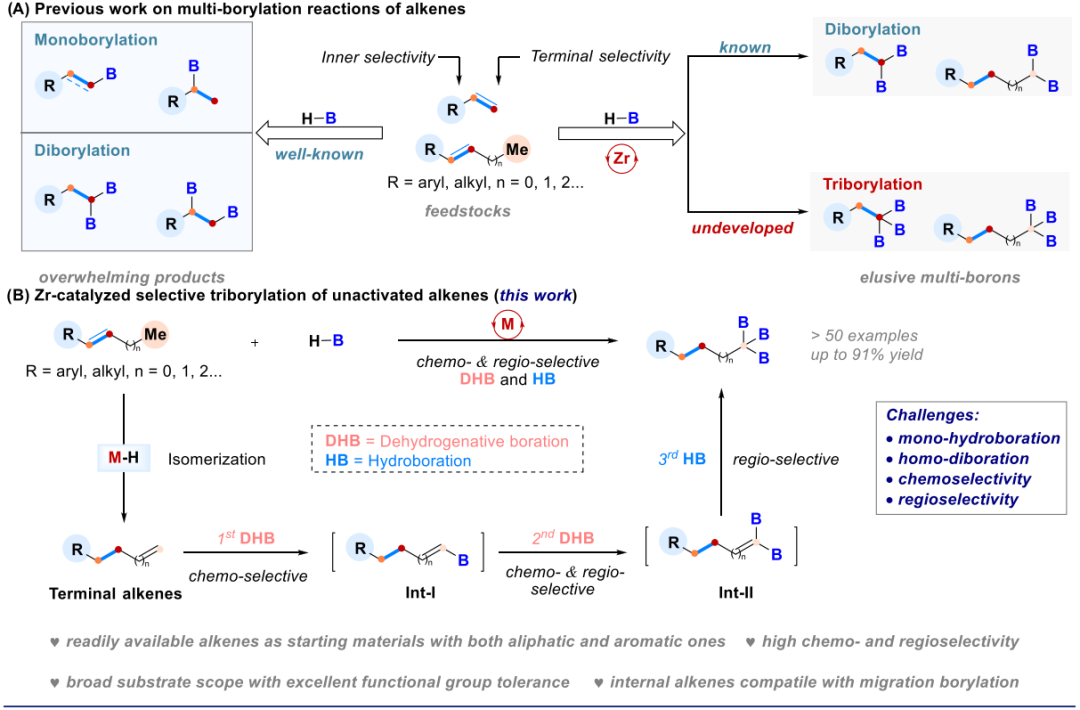 福州大学化学学院宋秋玲教授课题组一直致力于有机硼化学的领域研究(Acc. Chem. Res., 2021, 54, 2298-2313)。近年来在不饱和化合物的硼化方面也取得了一系列成果 (Nat. Chem. 2024, 16, 1312; Nat. Chem. 2024, 16, 42; J. Am. Chem. Soc. 2021, 143, 13124; Nat. Commun. 2022, 13, 3524; Nat. Synth. 2023, 2, 140; J. Am. Chem. Soc. 2024, 146, 10167; ACS Catal.2024, 14, 11318; Sci. China Chem., 2025, 68, 1929)。受本课题组前期一些工作的启发,作者提出了一种全新的设想:在锆催化作用下,烯烃和硼烷或许能够经历两步脱氢硼化反应,生成 1,1-二硼基烯烃;随后,再通过化学选择性硼氢化反应,最终得到 1,1,1-三硼基烷烃。特别值得一提的是,Schwartz试剂(Cp2ZrHCl)具有独特的 “Zr-walk” 能力,能够使内烯烃沿着烷基链迁移至末端位置,进而实现内部烯烃的远程 1,1,1-三硼化。这一创新方法为1,1,1-三硼基烷烃合成开辟了新路径,突破传统限制,提升合成效率,有望推动有机合成领域朝着更加高效、绿色、智能的方向大步迈进。