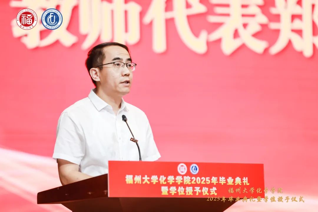 福州大学发展规划与学科建设处处长郑寿添教授作为教师代表发言,他深情回忆并分享了自己的求学之路,以此真挚勉励毕业生们以初心为锚,锚定时代坐标,用所学、所思、所行,为社会的进步添砖加瓦;以学习为帆,航向无限可能,把每一次挑战都当作成长的机会,不断学习实践,提升能力;以感恩为舵,传递温暖力量,在他人需要帮助时,毫不犹豫地伸出援手。期待他日重逢时,以更好的模样,共话化院新的荣光。