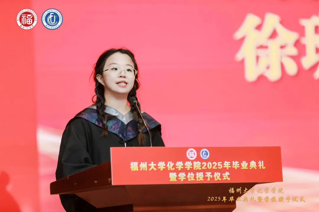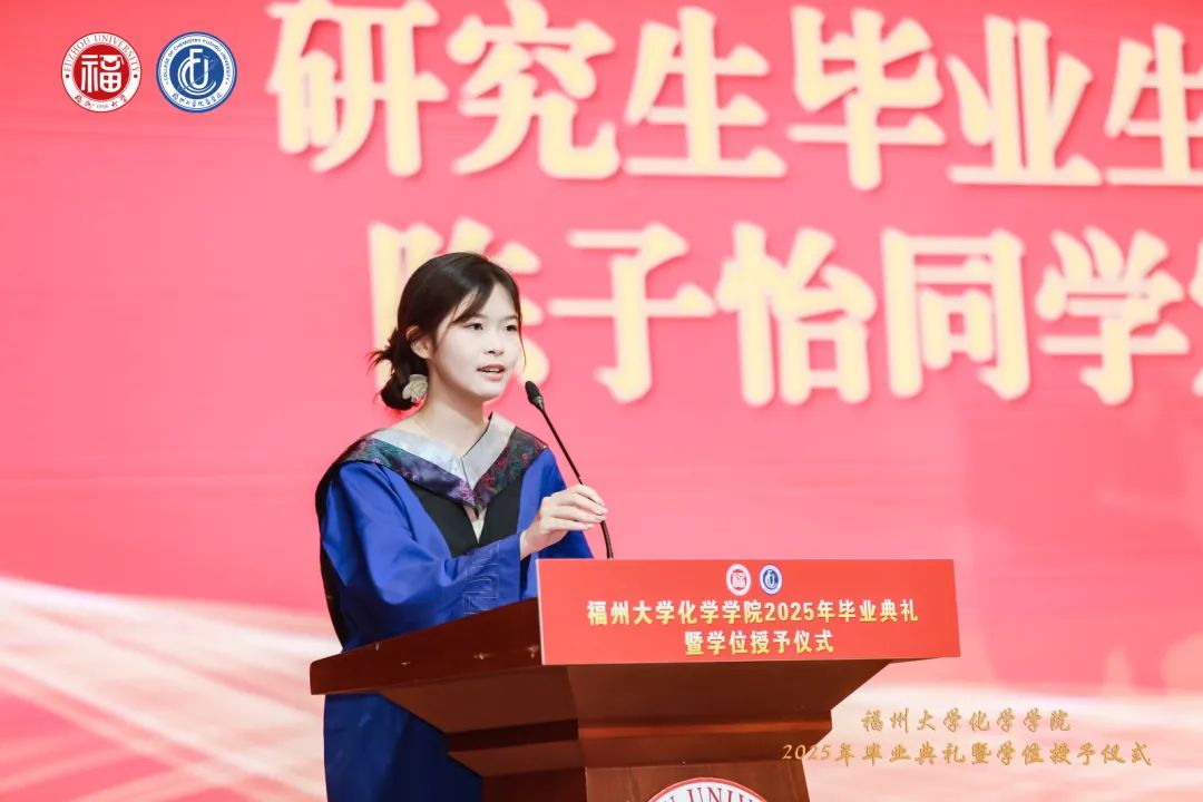 2022级硕士陈子怡同学作为研究生毕业生代表发言,分享了自己的青春印记,用“感恩、传承、担当”三个词概括心情,强调化学人既是知识接收者也是科学探索者,需传承科研责任。她号召毕业生以创新回应时代挑战,用分子尺度的突破践行使命担当。