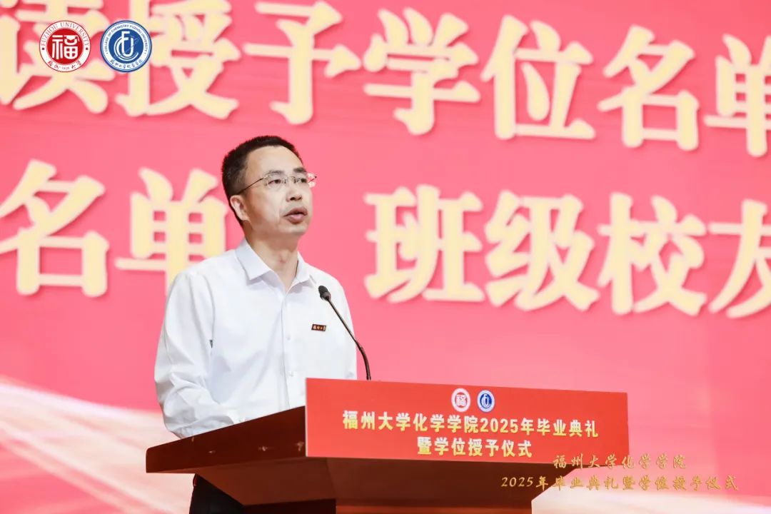 学院党委曾忠毅书记宣读《福州大学关于授予2025届毕业生学位的决定》名单、2025届优秀毕业生名单、2025届班级校友联络员名单。