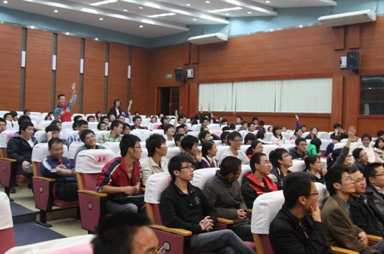 在第一轮的必答题中,8支代表队表现神勇,比分上互不相让。值得注意的是来自化学化工学院的向日葵队,八题全对拿到满分。比赛进入第二环节后,响当当队的四朵金花凭借着敏捷的答题速度,连连得分,建立起了可观的领先优势。两轮紧张的答题环节后,主持人把答题的机会让给了场下跃跃欲试的观众。大家参与的热情高涨。主持人没有念完题目的选项,有的同学就已经等不及要站起来回答问题了,选择题被当成了填空题回答。不过大家准确的答案也得到了精美礼品的回报。人人参与,这才是比赛的宗旨。