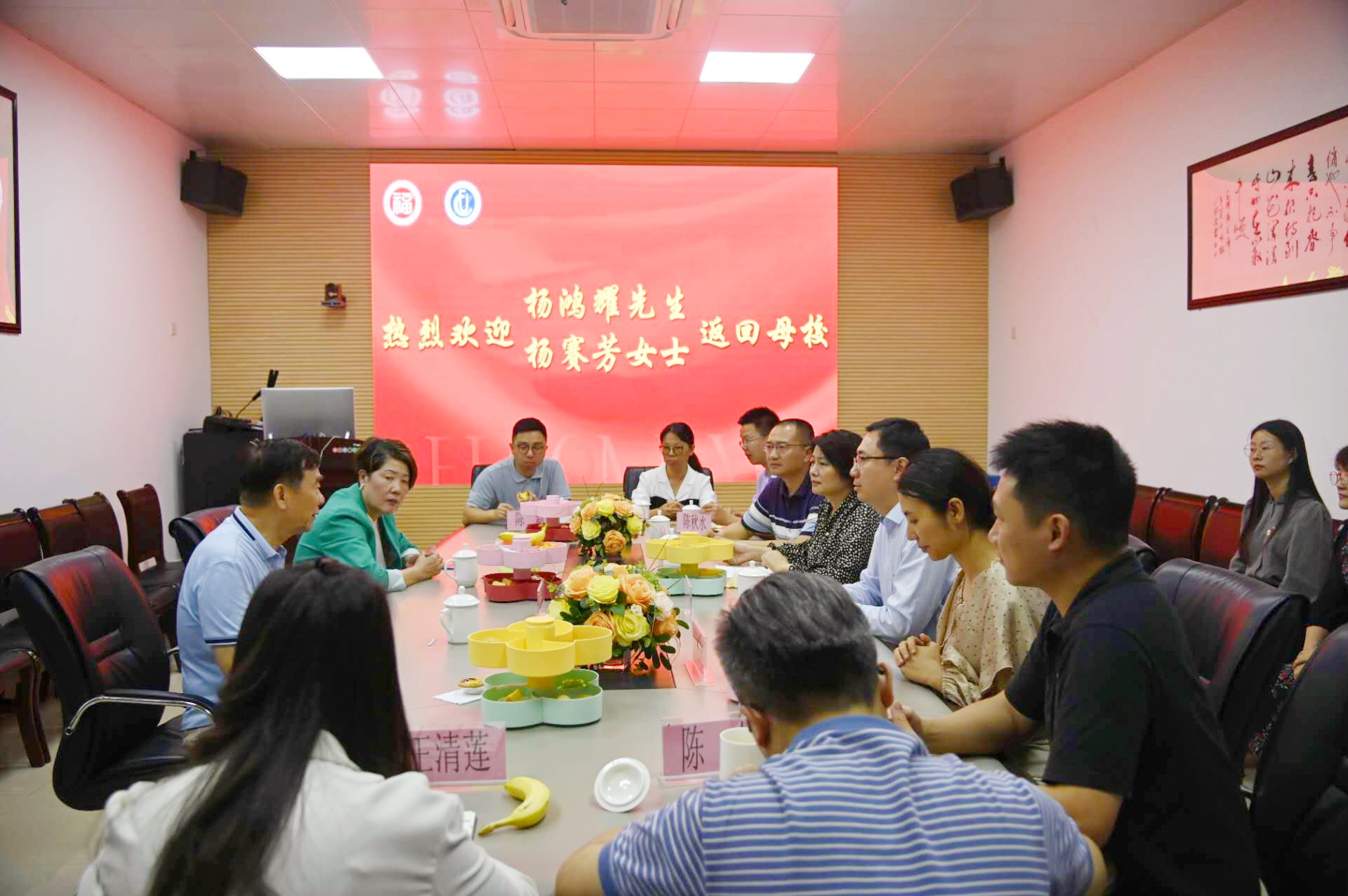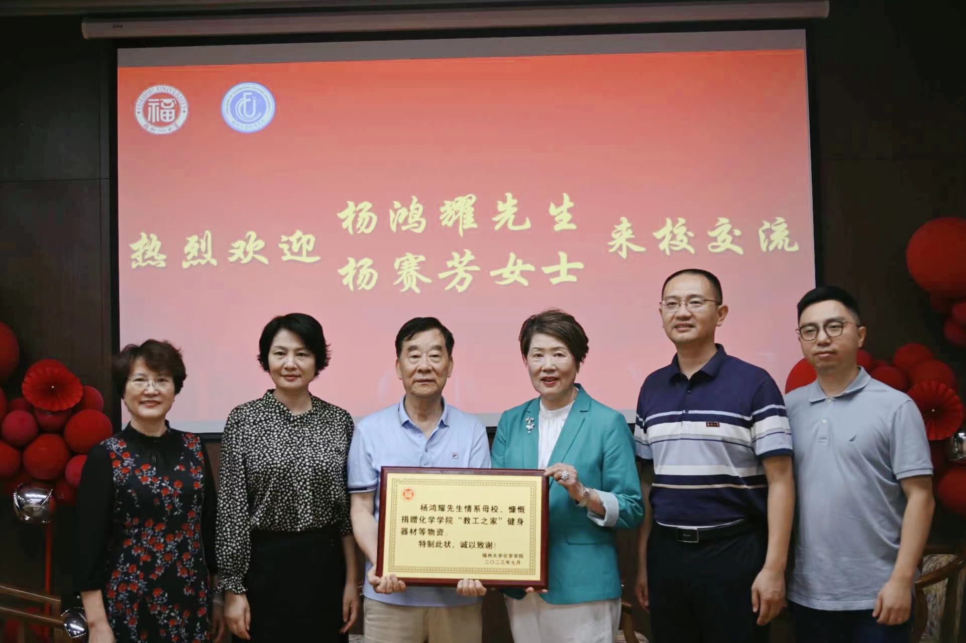 在嘉锡楼504会议室,张泓书记、林航书记分别代表化学学院、石油化工学院对杨鸿耀先生及其夫人杨赛芳女士致以诚挚的感谢与崇高的敬意!他们表示,杨鸿耀校友为了感恩和回馈母校,从2003年开始至今,先后向母校捐赠设立化学化工学院院史室、“杨鸿耀楼”、“杨鸿耀奖教奖学金”、“旗山校区亿年火山口种植樱花林”等多个捐赠项目。65周年校庆之际,杨鸿耀先生及其夫人杨赛芳女士再次慷慨捐赠400万港币支持学校教育事业发展,并为化学学院教工之家、石油化工学院及化学学院学生社区一站式服务中心捐赠了一批健身器材,这份对母校的赤子之情令人感动。