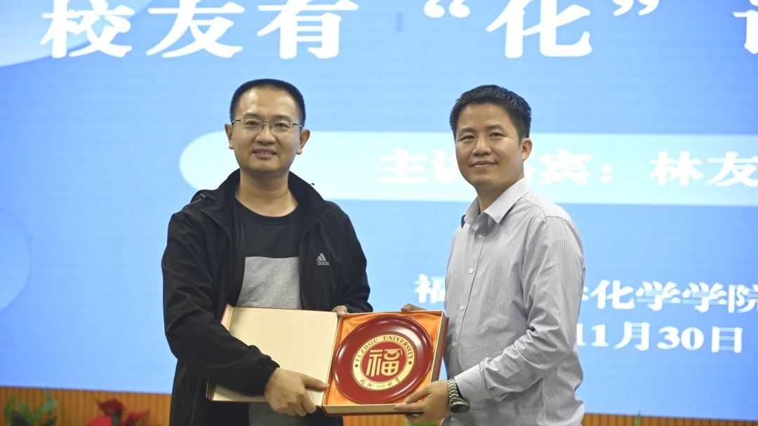 化学学院党委常凯副书记对林友辉校友的发言进行了总结,并针对考研保研相关政策和资讯进行进一步补充,鼓励同学们积极和优秀学长学姐交流,借鉴他们的宝贵经验。随后,常凯副书记为林友辉校友致赠校庆纪念品。