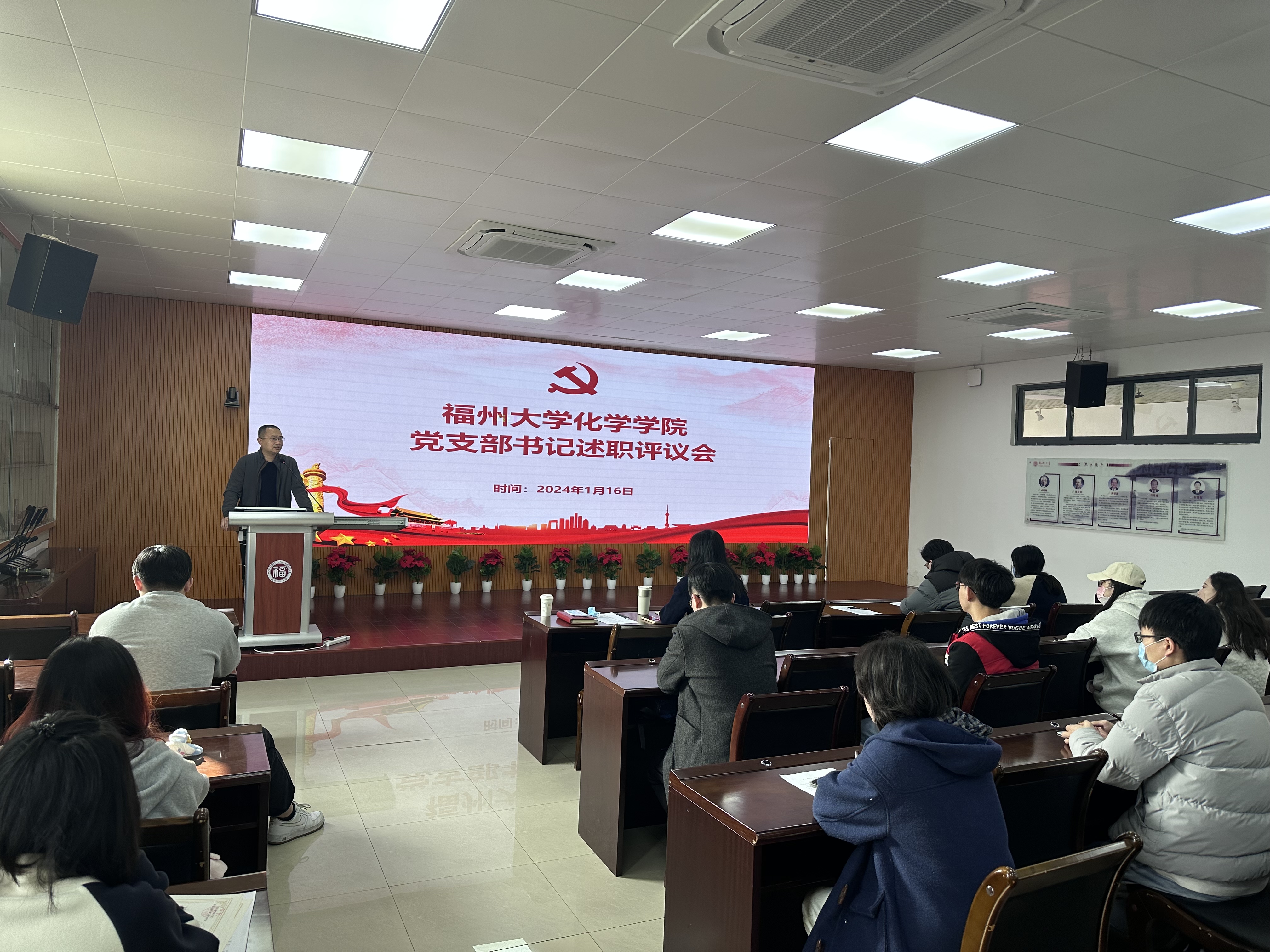 为深入学习贯彻习近平新时代中国特色社会主义思想和党的二十大精神,认真贯彻落实校党委组织部《关于做好2023年度党组织书记抓基层党建工作述职评议考核的通知》工作,加强基层党支部建设,发挥党支部的战斗堡垒作用,以高质量党建引领学院高质量发展,2024年1月16-17日,化学学院分别在三个会场召开了2023年度党支部书记述职评议会议,检验各党支部书记2023年围绕中心抓支部党建工作的情况。学院党委张泓书记、常凯副书记以及各年级辅导员参加述职大会。