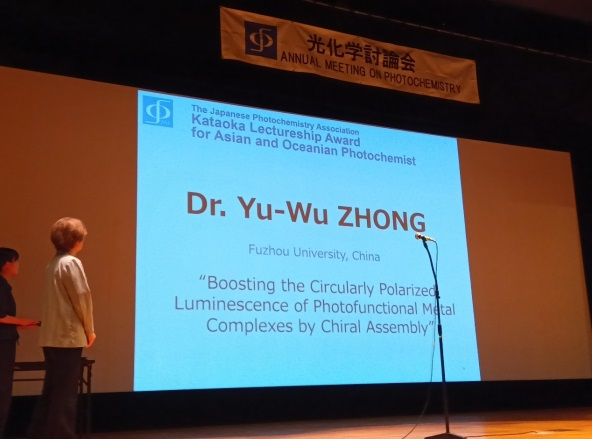 近日,在日本东京举行的日本光化学协会2025年度会议上,福州大学化学学院“分子工程+”研究院钟羽武教授荣获日本光化学协会(Japanese Photochemistry Association, JPA)设立的“亚洲及太平洋地区Kataoka光化学家讲座奖”。作为本年度唯一获奖者,钟羽武教授在会议上作了获奖报告,并接受日本光化学协会主席Masako Kato教授为其颁发的获奖证书,表彰其在“手性组装增强光功能金属配合物圆偏振发光”方面所做的开创性工作。