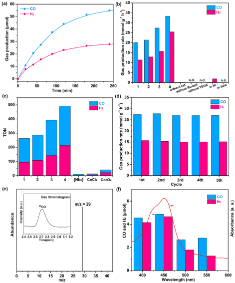 考虑到钴氧化物和铌氧化物都是潜在的光催化材料,该团队初步研究了这些核-壳型钴铌异金属氧簇在可见光驱动光催化CO2还原方面的性能,结果显示以合成气作为催化产物的产率远高于目前绝大多数的多金属氧簇基光催化剂,表明了它们具有优异的光催化活性 (图3)。研究者利用稳态和瞬态荧光光谱法和密度泛函理论计算等方法确定了核-壳型团簇作为分子催化剂的催化活性位点并提出可能的反应机理,通过对已知反应路径中间体自由能的计算,进一步验证了实验的结果。