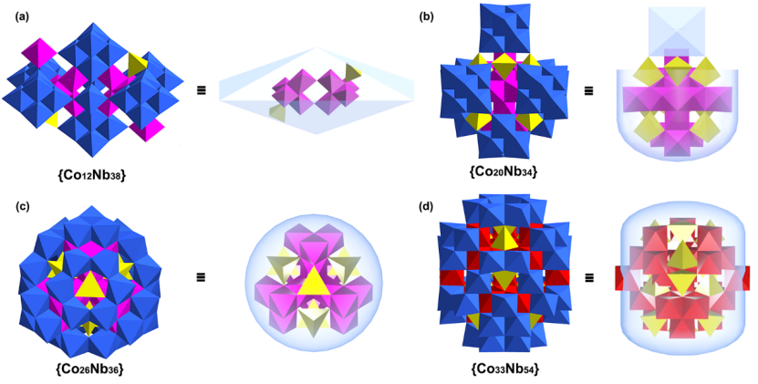 最近,福州大学郑寿添课题组与黄剑东教授及林森教授等课题组合作,在碱性反应条件下,巧妙地使用作为原位氧化剂H2O2的供给者,发展了一种可合成含混合钴价态的核-壳型钴铌异金属氧簇的合成策略,成功获得了一系列罕见的由铌氧簇壳层包覆混价钴氧簇核形成的全无机高核-壳型钴铌异金属氧簇,包括八面体型的[CoIII10CoII2Nb38O110(OH)16(H2O)6]12- (Co12Nb38),篮型的[CoIII12CoII8Nb34O119(OH)9]25- (Co20Nb34)、球型的[CoIII16CoII10Nb36O140]32- (Co26Nb36)以及桶型的[CoIII19CoII14Nb54O184(OH)4]17- (Co33Nb54)} (图1)。这些核-壳型纳米分子簇具有新颖的结构特征和纳米级尺度(1.4-2.1 nm),是目前已知的最大的分子型钴铌异金属氧簇。