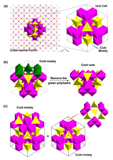 众所周知,立方尖晶石Co3O4作为重要的磁性和半导体材料,已广泛应用于催化、太阳能电池、固态传感器等领域。获得具有精确原子结构的立方尖晶石Co3O4的分子片段有助于研究Co3O4块材的局部结构和电子性质,并探究其构效关系。立方尖晶石Co3O4的晶胞组成如图2(a)所示,是由16个CoO6八面体和10个CoO4四面体通过共边或共顶点构成的具体Td点群对称的超四面体氧簇(立方尖晶石Co3O4的单胞实际上只包含8个CoO4四面体,之所以有10个CoO4四面体的原因是其中4个与相邻的4个单胞共享)。