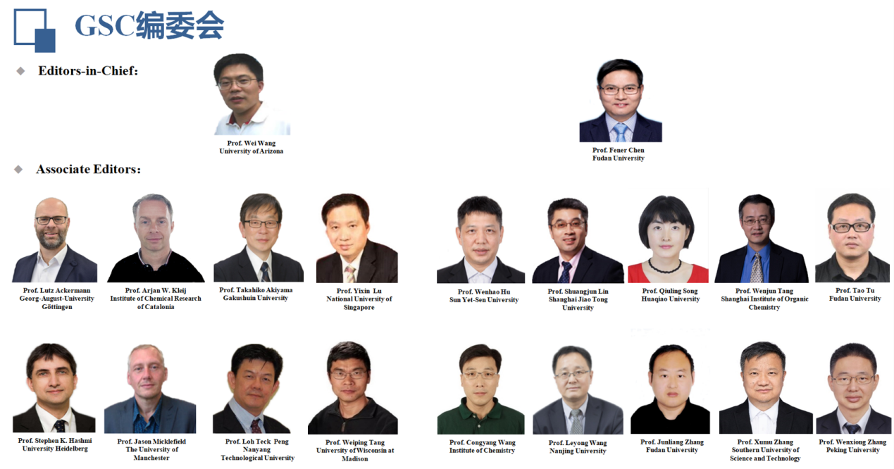 GSC的编辑和编委团队阵容强大,主编由中国工程院陈芬儿院士和亚利桑那大学王卫教授担任。目前共有173名编委,编委团队国际化,均由来自中国、德国、日本、英国、法国、美国、新加坡、南非、新西兰等19个国家的国际知名专家担任,其中,包括中国工程院院士1名,外籍院士2名。