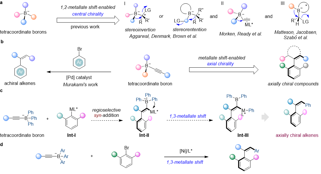 近些年来,由于四配位硼的独特性质,对其研究也越来越广泛。四配位硼化合物不仅是许多有机硼化学反应的关键中间体,同时也是有着很好应用前景的新型光学材料。在有机合成领域中,迁移反应、转金属化以及氧化反应是其主要的反应类型。其中,基于四配位硼的不对称合成去构建手性分子的报道目前主要分为三种类型:(1) 具有手性碳立体中心的烷基四配位硼物种以立体翻转或立体保留的方式,通过1,2-迁移构建手性分子;(2) 烯基四配位硼物种在手性π激活剂—过渡金属/手性配体的存在下,通过不对称1,2-迁移来构建中心手性分子;(3) 通过手性辅助剂在硼原子上产生手性环境,从而通过诱导立体专一的1,2-迁移来控制手性分子的产生。值得注意的是,目前这些转化都仅限于通过1,2-迁移来构建碳中心手性(图1a所示),然而基于四配位硼的远程迁移去构建其他类型的手性分子,例如轴手性分子等,尚未见过报道。