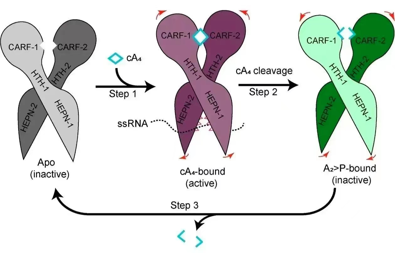 图2.cA4介导的TtCsm6核糖核酸酶变构激活机制的示意图