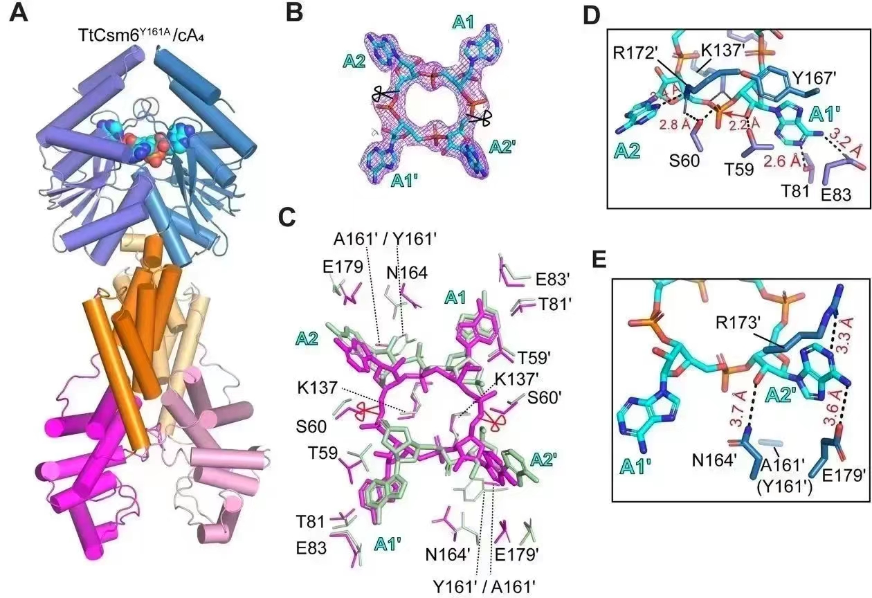 图1.TtCsm6与cA4复合物的晶体结构及二者的相互作用细节图