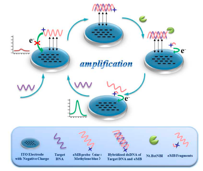 传统的电化学发光传感器大多将DNA固定与电极表面,电极的打磨、清洗、活化耗时且操作繁琐,重现性不高。此外,核酸探针与目标物的作用发生在电极与溶液的固液异相界面上,使得空间位阻作用增强、作用效率降低,延长了检测时间。这些不足在一定程度上限制了传感器的实际分析应用。不同长度的DNA带有不同量的负电荷,同带有负电荷的ITO电极间具有不同大小的静电排斥的特性,带有短链的DNA的电化学信号探针可以更加容易扩散到电极表面,产生增强的电化学信号,该课题组基于此原理构建了简单的免电极修饰的均相电化学传感器。DNA和目标物的作用是在均相溶液中进行,具有效率高、重现性好等特点,实现对食品污染物(如赭曲霉毒素、三聚氰胺等)和DNA甲基化水平以及特定疾病DNA等的高灵敏分析。随后他们将ECL探针修饰于DNA电极上,利用类似原理,构建了高灵敏、重现性的均相免修饰ECL传感器,应用于食品中OTA以及生物标志物RNase A 的活性、TF NF-κB p50含量的分析检测(Anal. Chem., 2015, 87, 9204-9208; Anal. Chem., 2015, 87, 11826–11831; Biosens. Bioelectron., 2018, 105, 182-187; Trends Anal. Chem., 2023, 159, 116943)。
