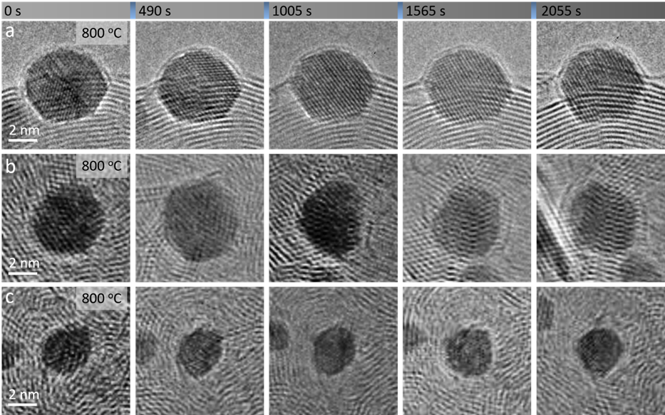 Figure 4. (a-c) Sequential HRTEM images of Ir NPs with different sizes recorded at 800 °C, showing high thermal stability against sintering and migration at 800 °C.