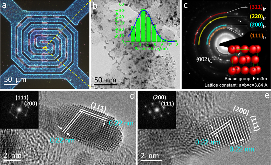 Figure 1. (a) An optical image of a MEMS-based heating chip (SiN film) with the loaded Ir/C specimen. (b) TEM, (c) SAED and (d,e) HRTEM images of Ir/C. Insets in (b), (c) and (d,e) show the particle size distribution, the crystal model of metallic Ir, and the FFT patterns, respectively.