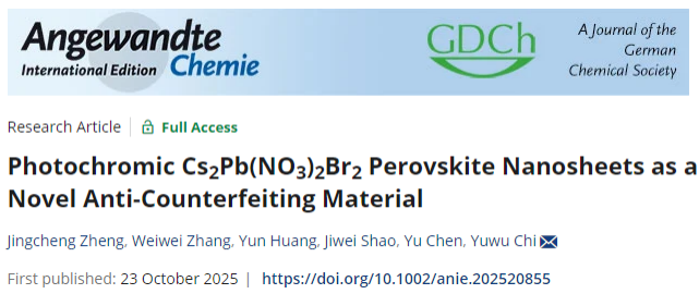 论文信息:J. Zheng, W. Zhang, Y. Huang, J. Shao, Yu Chen, Y. Chi, Photochromic Cs2Pb(NO3)2Br2 Perovskite Nanosheets as a Novel Anti-Counterfeiting Material Angew. Chem. Int. Ed. 2025, e202520855. //doi.org/10.1002/anie.202520855