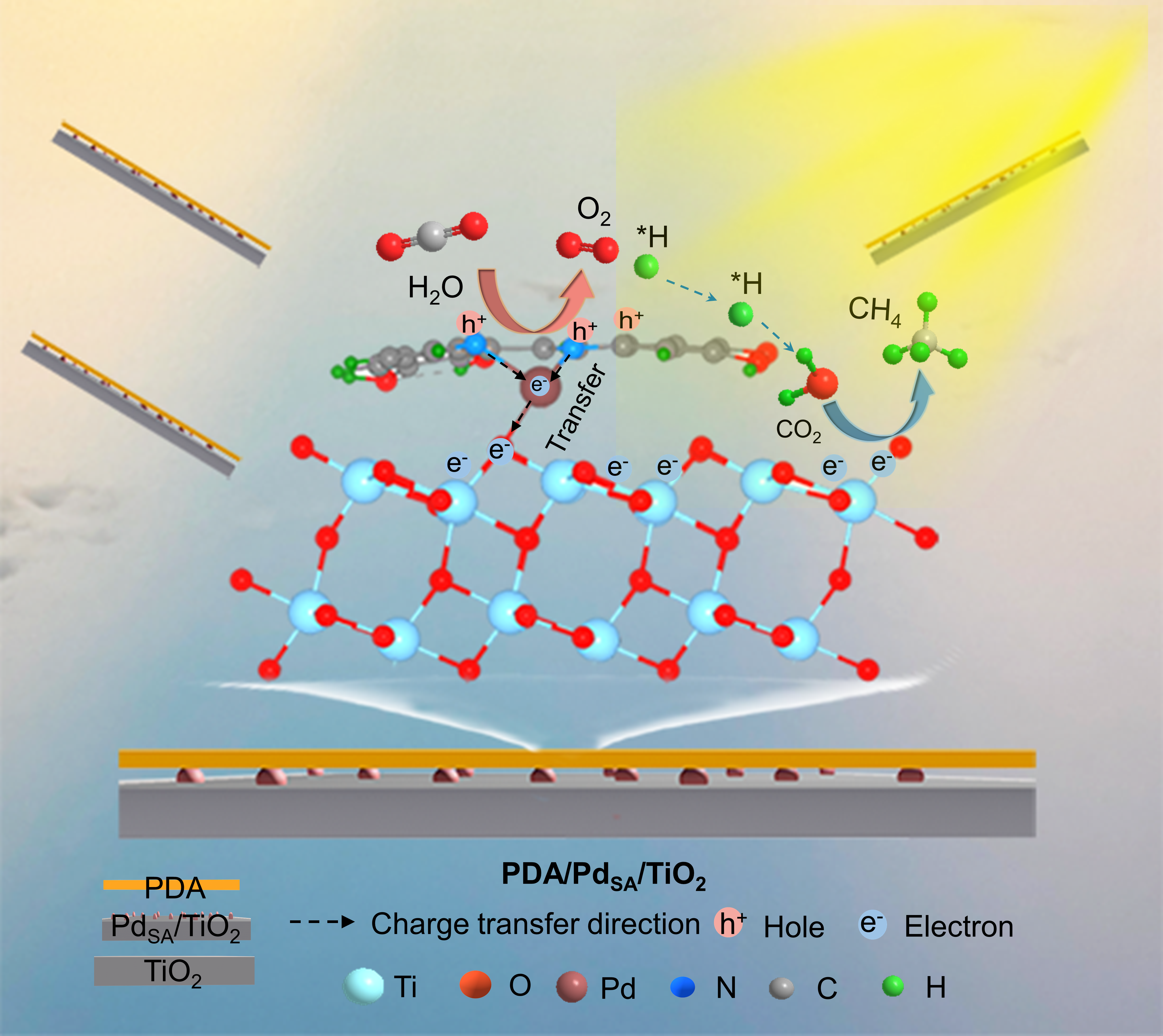 针对上述挑战,张子重教授团队提出了一种构建“单原子电荷转移桥”策略,通过在PDA修饰的TiO2异质结界面构建O-Pd-N配位结构的钯单原子电荷转移桥,成功研制出PDA/PdSA/TiO2复合光催化剂。该设计实现了以下突破:1. 最短路径电子传输:Pd单原子桥为电子转移提供最短、最直接的跨界面传输通道;2. 高效电荷转移通道:O-Pd-N结构作为一条高效的电荷转移通道,显著提高了界面电荷转移速率,并优化了电荷转移效率。3. 增强质子供给能力:PDA中丰富的亲水性基团促进了H2O的吸附和解离,提高了*H的覆盖度,为CO2深度氢化提供充足质子源。在纯水条件下,PDA/PdSA/TiO2展现出卓越的光催化CO2还原性能,其CH4产率为37.28 μmol g-1 h-1,选择性达到98.13%。该研究不仅为解决异质结界面电荷传输瓶颈提供了新思路,也为发展高效、高选择性CO2甲烷化催化剂开辟了新路径。