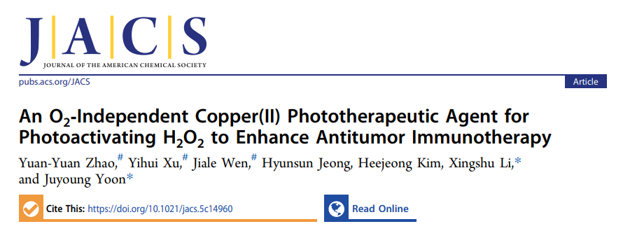 近日,我院李兴淑教授团队最新研究成果以“An O2-Independent Copper(II) Phototherapeutic Agent for Photoactivating H2O2 to Enhance Antitumor Immunotherapy”为题发表在在国际知名学术期刊《Journal of the American Chemical Society》。