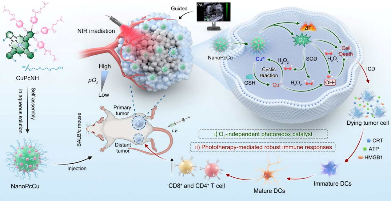 针对这些问题,李兴淑教授团队设计合成了含胺基基团和多乙二醇基团修饰的不对称铜(II)酞菁分子,并通过自组装构建了一种多功能、不依赖O2的纳米光诊疗剂 (NanoPcCu)。NanoPcCu可在近红外光照射下实现自适应的光动力过程,表现出高的O2·-生成能力、显著的光热转换效率和优异的光声成像能力,同时还具有新型的光氧化还原特性,能够在常氧和缺氧条件下,通过Cu(II)和Cu(I)之间的光氧化反应,催化H2O2转化为剧毒的OH•。生成的自由基(OH•和O2·-)与热协同作用,协力诱导肿瘤细胞死亡,展现出强大的耐缺氧光动力治疗性能。NanoPcCu在缺氧条件下仍保持显著的光细胞毒性,其半数抑制浓度(IC₅₀)仅为0.12 ± 0.02 μM,比商业光敏剂亚甲蓝低102倍。同时,其在缺氧条件下的光治疗指数值高达4166,表明其兼具强效光敏活性与优异生物安全性。低剂量的NanoPcCu (静脉注射,0.8 nmol g⁻¹)结合低的光照剂量(300 J cm⁻²),即可在临床前肿瘤模型中实现对肿瘤生长的完全抑制。特别的是,NanoPcCu介导的光疗不仅在临床前模型中抑制了肿瘤生长,还能诱导全身性抗肿瘤免疫反应。最终,在双侧肿瘤模型中,原发肿瘤的生长抑制率高达96.7%,远处转移肿瘤的生长抑制率达到72.5%,显示出显著的PIT抗肿瘤效果。本研究不仅提供了一种高效的光治疗平台,也为开发基于过渡金属的多功能光敏剂提供了新思路。