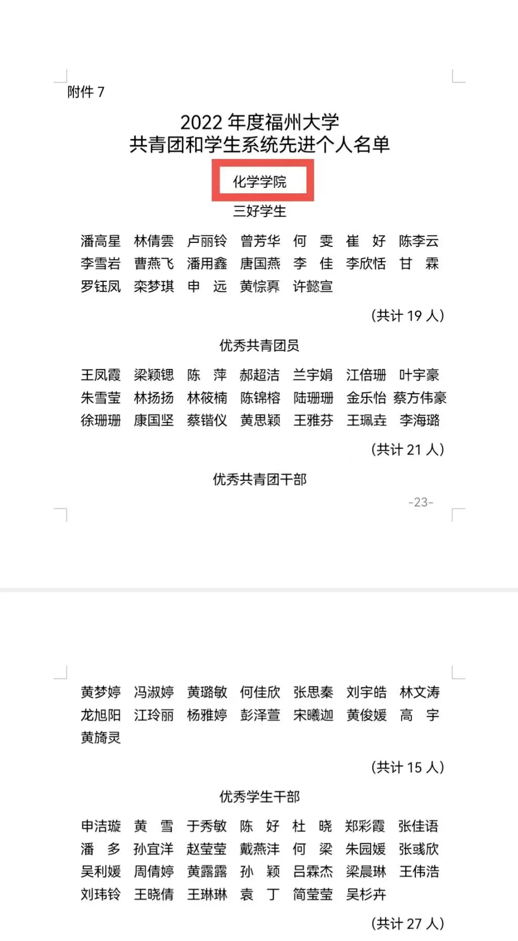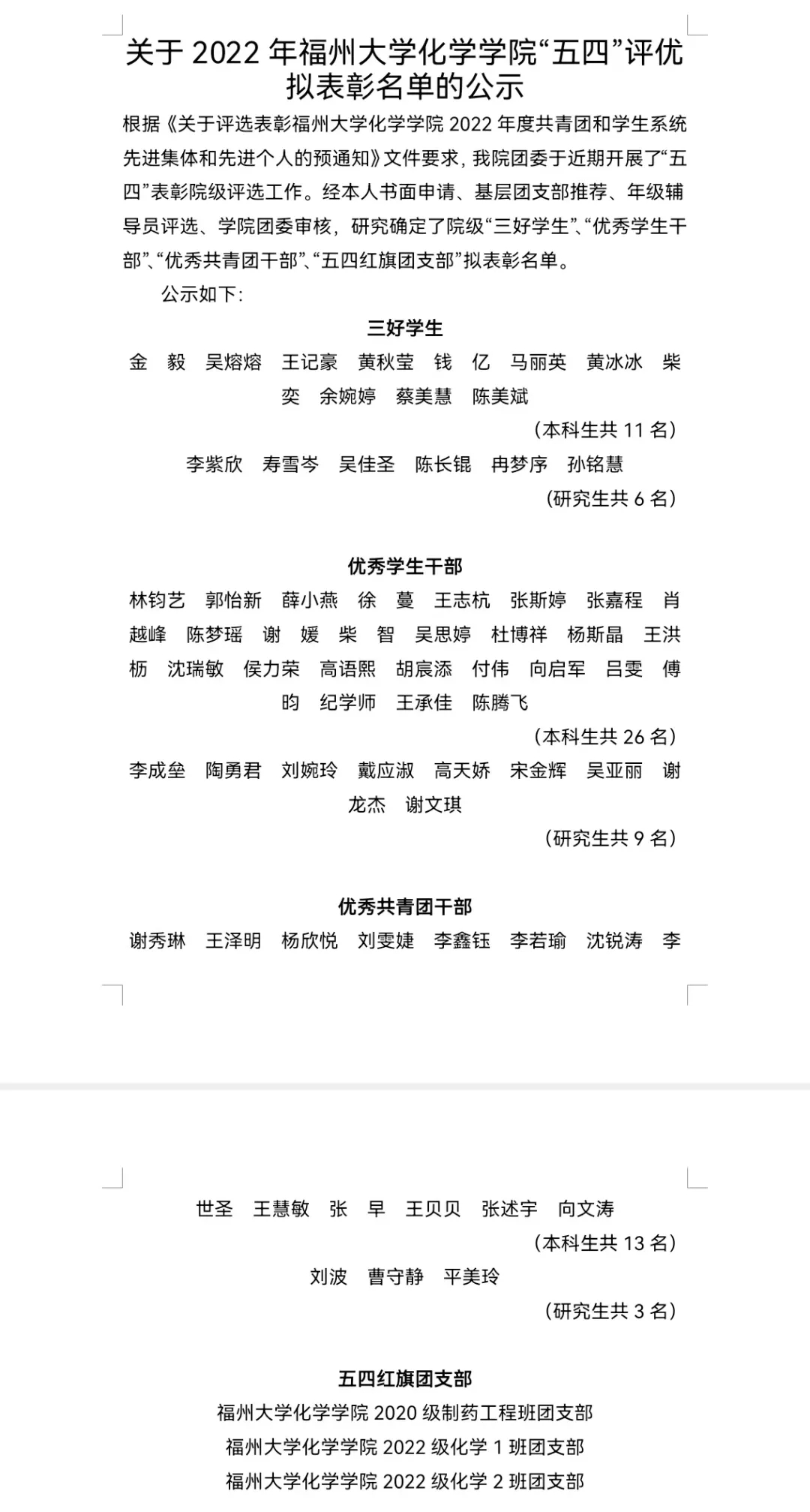 福州大学化学学院2022年度共青团和学生系统先进集体和先进个人拟表彰名单