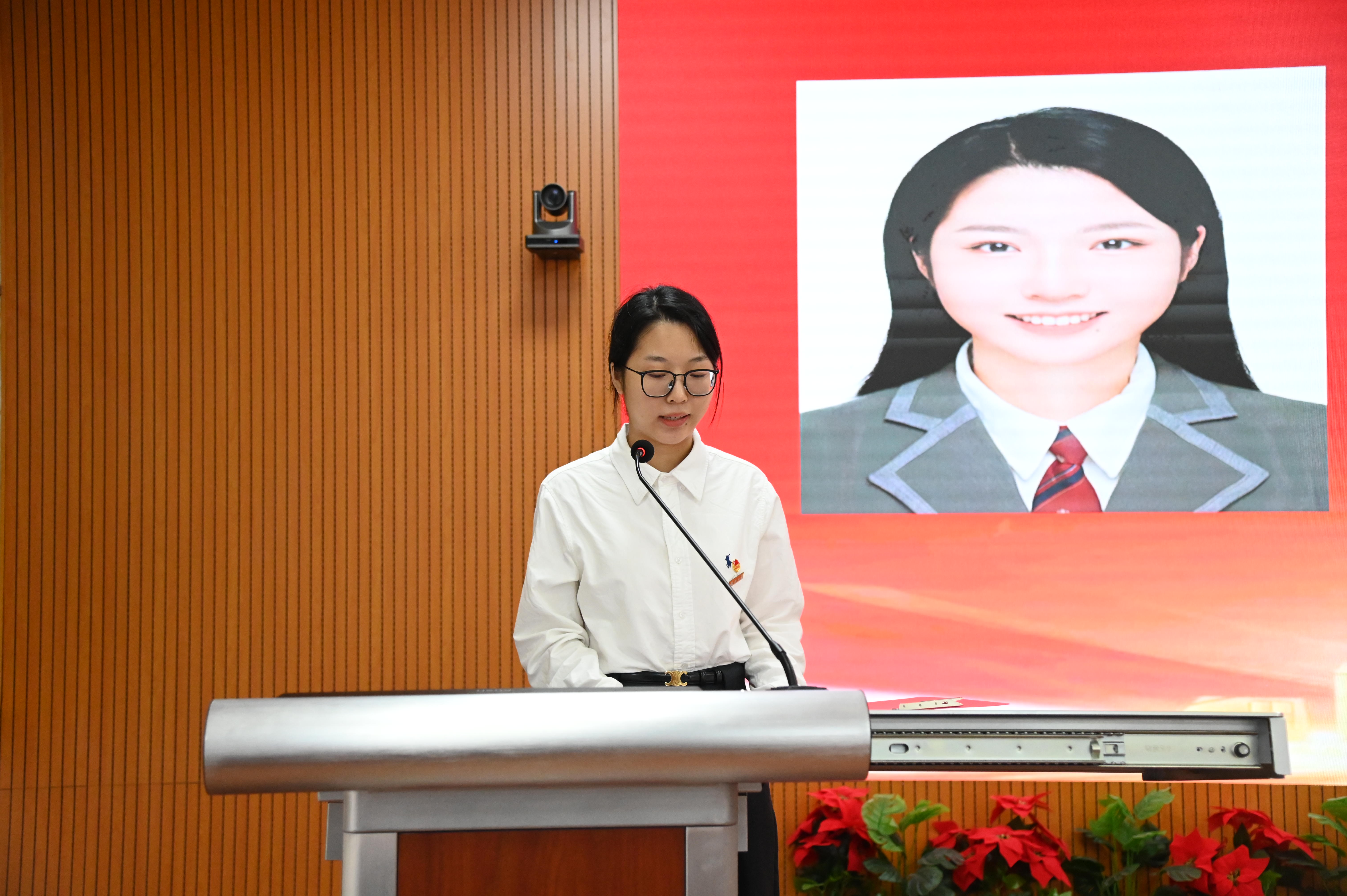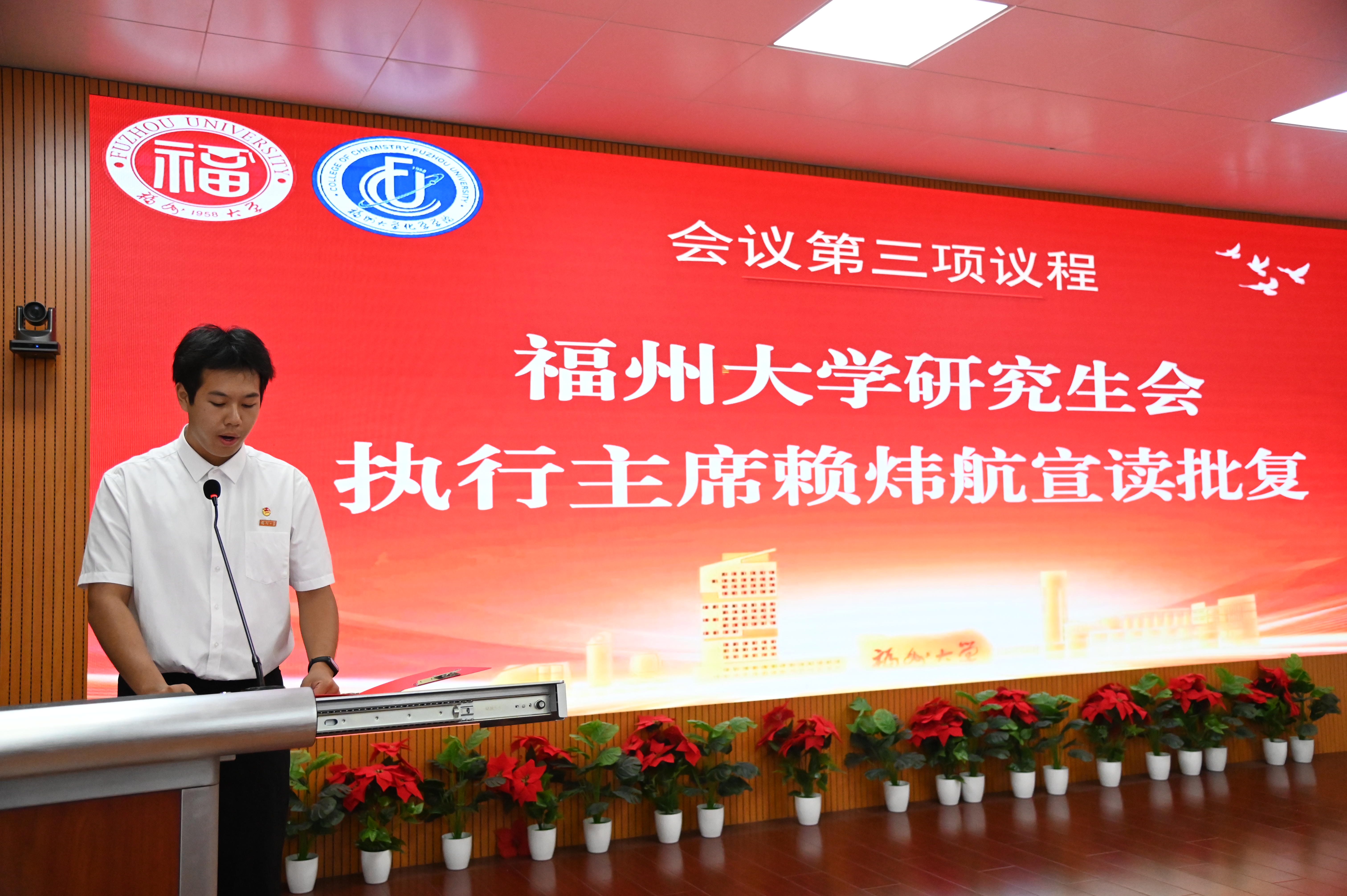 福州大学研究生会执行主席赖炜航宣读校研究生会批复并致辞。在致辞中,赖炜航肯定了化学学院研究生会在搭建学术交流平台、助力科研能力提升、组织社会实践活动、凝聚研究生群体力量、优化日常服务细节等方面取得的显著成效,也对化学学子在学术论文发表、科研项目申报、学科专项竞赛等领域展现的扎实功底与亮眼成果表示高度认可,并代表校研究生会向大会的召开致以热烈祝贺。