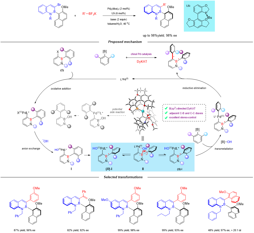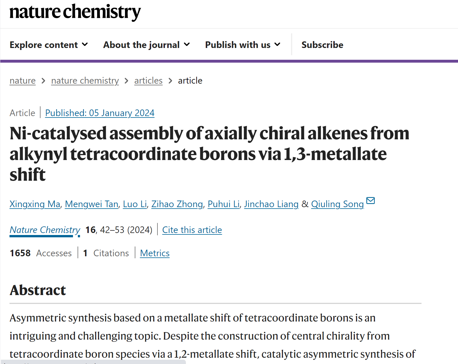 2024年1月5日,我院宋秋玲教授课题组在《自然化学》(Nature—Chemistry)在线发表了题为"Ni-catalyzed assembly of axially chiral alkenes from alkynyl tetracoordinate borons via 1,3-metallate shift"的研究论文,设计并报道了对映、区域和阻旋选择性良好的镍催化策略,通过炔基四配位硼的1,3-迁移构建一系列轴手性烯烃化合物。近些年来,由于四配位硼的独特性质,对其研究也越来越广泛。四配位硼化合物不仅是许多有机硼...